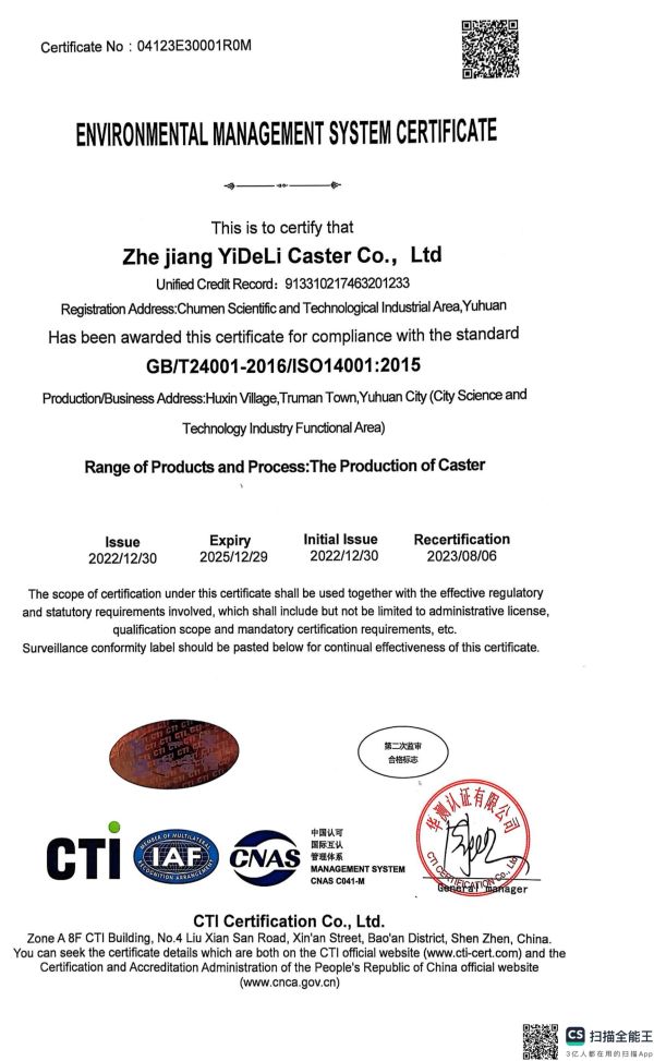 Established in 1987, Zhejiang EDL Casters Co., Ltd. is a modern enterprise which specializes in producing wheels and casters with an area of 25,000 square meters at Taizhou, Zhejiang, China, 2 hours by car from Yiwu. Our main products are casters and wheels casters, swivel casters, brake casters, mini casters, heavy duty casters, equipment casters, medical casters, industrial caster wheels, leveling casters and stainless steel casters. We have gained ISO9001 and ISO14001 Certificate and the service nets have been spread over each region in homeland, more than twenty countries and districts of European, American and Southeastern Asia market.